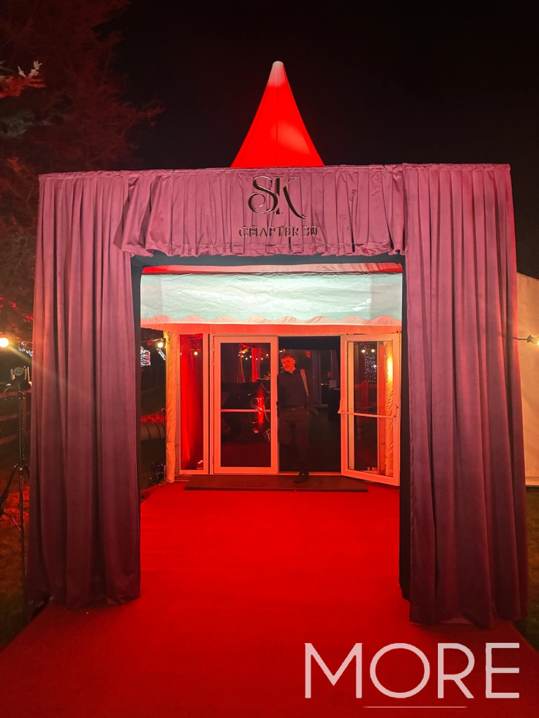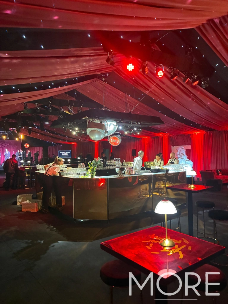 New Year’s Eve 30th Birthday party with Hollins Marquees. Featuring burgundy entrance drapes, horizontal linear ceiling drapes and marquee wall drapes.