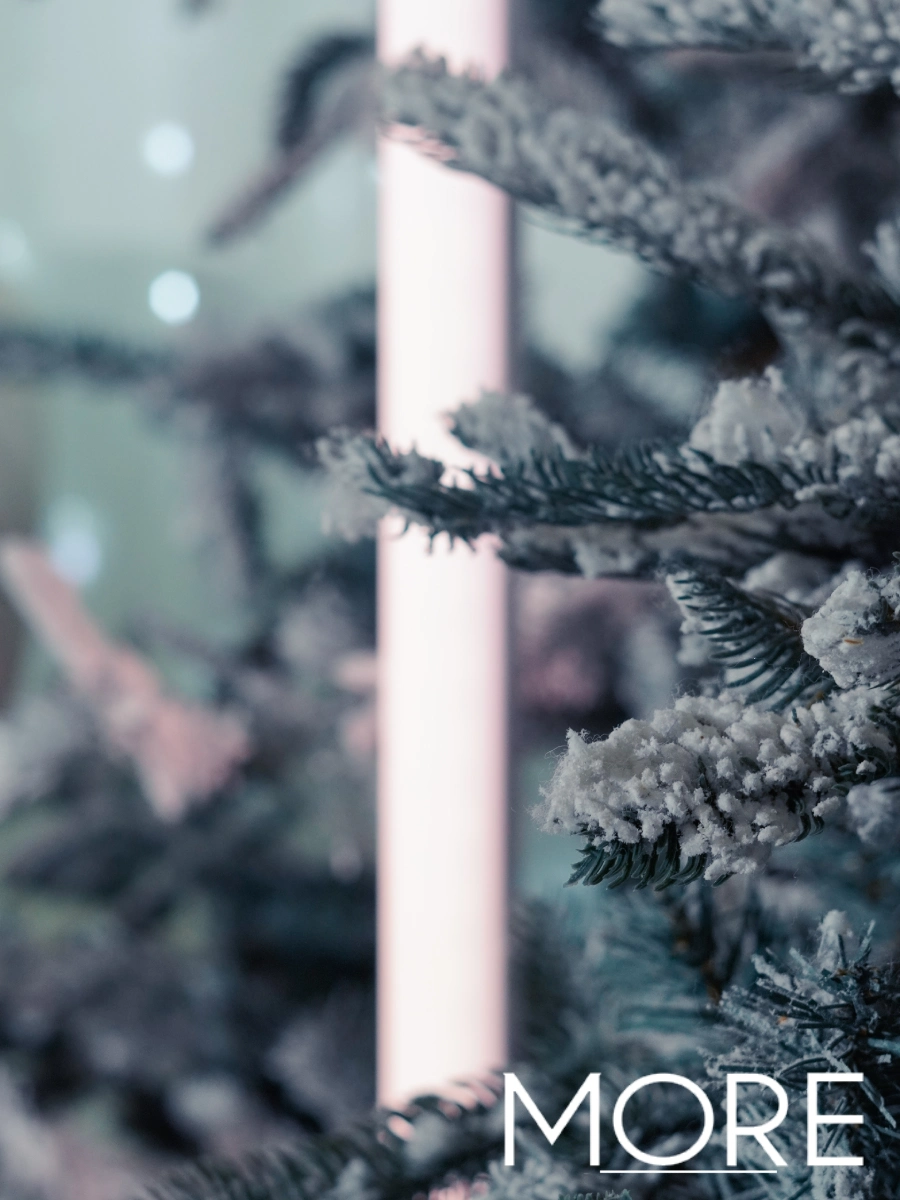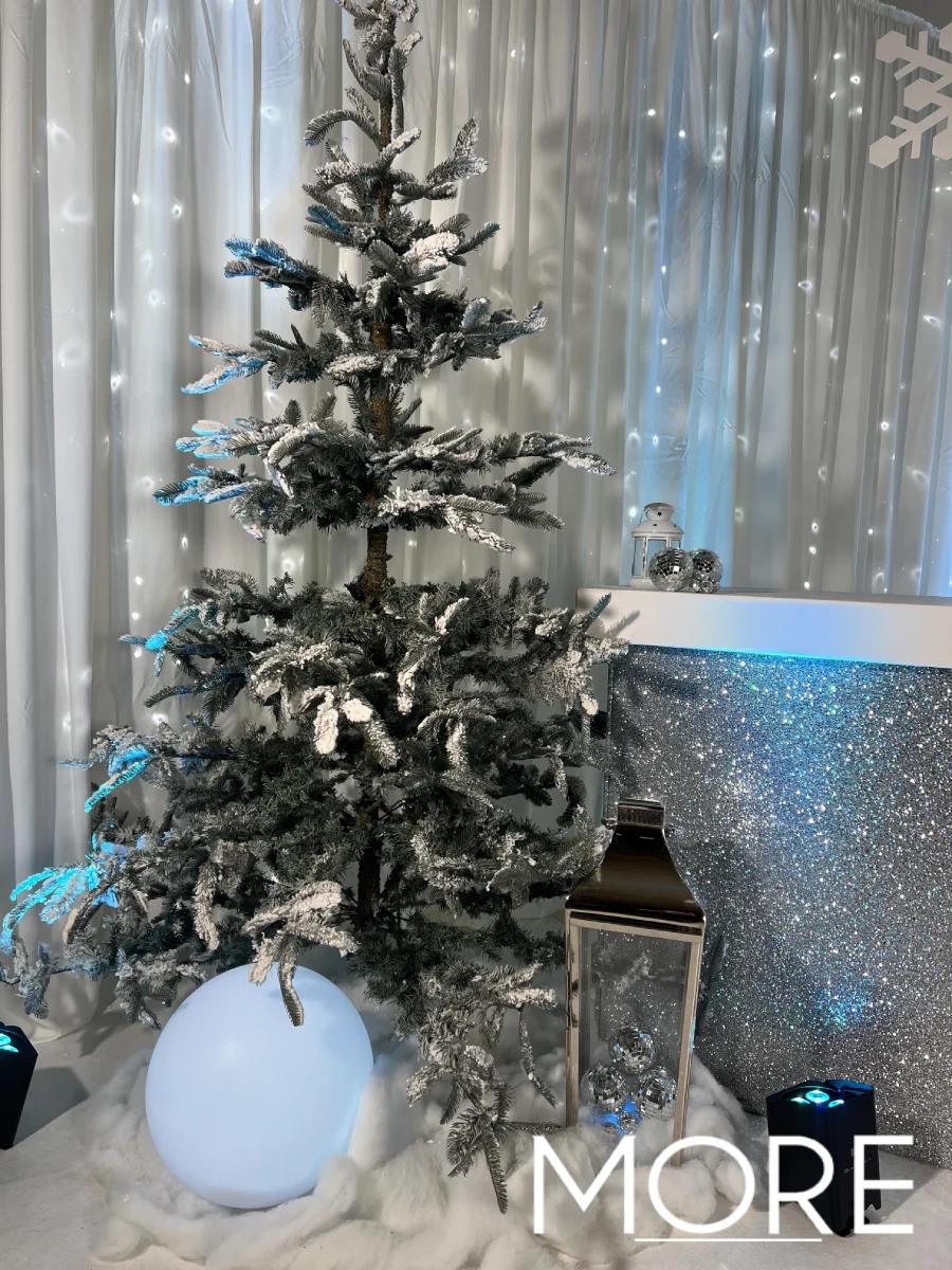 Scattered throughout the venue, snow-flocked fir trees and frozen-style trees in various heights bring the winter landscape indoors. These eye-catching props create cosy corners, photo spots, and visual interest throughout the room. It’s the winter wonderland everyone knows and loves — but with a twist. The addition of shimmering surfaces, teal tones, and disco reflections gives the setting a fresh, modern feel. It’s the perfect mix of festive nostalgia and contemporary style, ideal for creating memorable backdrops and photo moments throughout the venue.