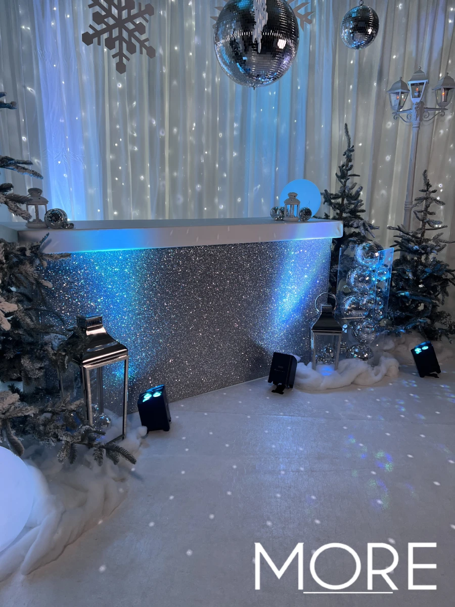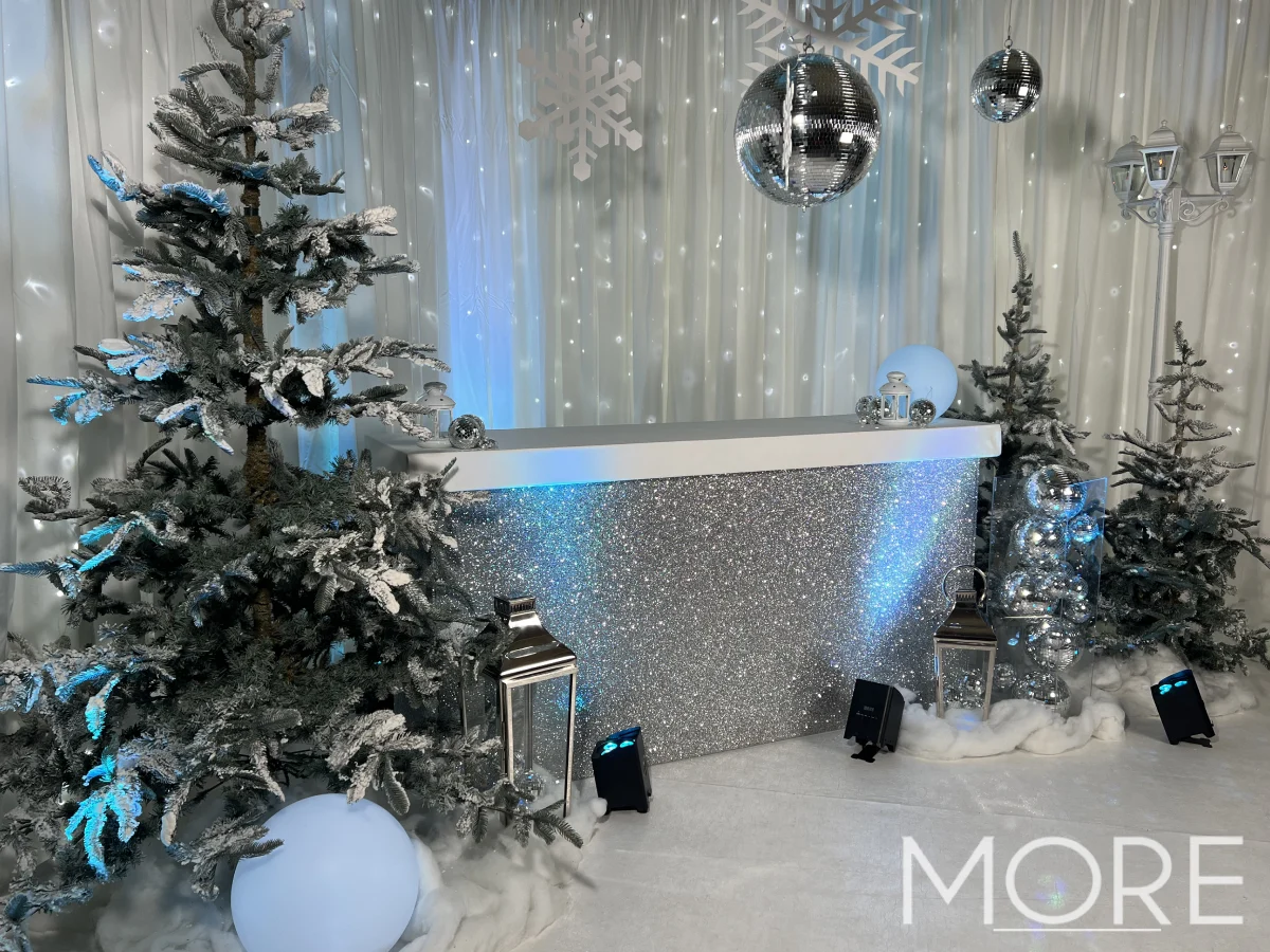 Our team specialises in event styling and prop hire, helping you bring your festive vision to life with creativity and flair. Whether you’re planning an elegant winter celebration or a full-on festive party, our Disco Winter Wonderland Christmas party theme guarantees a setting filled with sparkle and unforgettable moments.