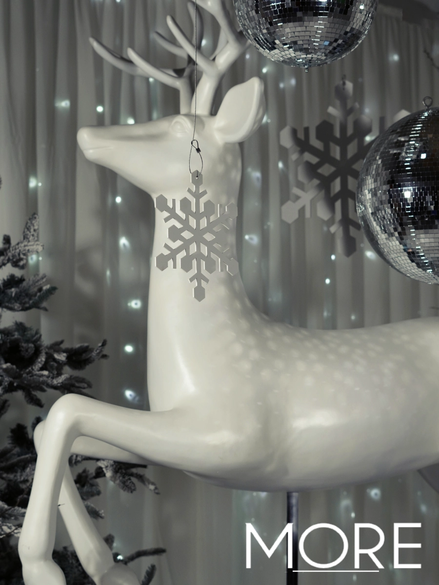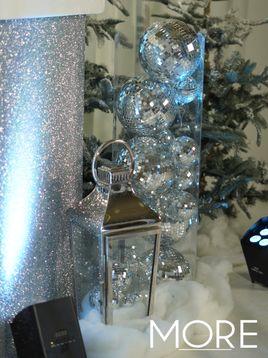 Bring the theme to life with statement pieces like our large white flying reindeer props, polar bear prop and charming white street lamps. Add a touch of extra sparkle with acrylic plinths and chrome lanterns filled with disco balls and LED lights, creating glowing, reflective features that instantly catch the eye. A light layer of artificial snow over bases of trees, props & lanterns completes the scene. Together, these elements celebrate the perfect blend of Christmas décor and disco décor — a creative twist that transforms any venue into a stylish, high-energy party setting.